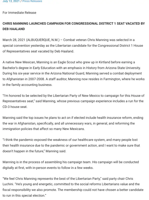 2021 July 13 PRESS RELEASE Chris Manning Launches Campaign for Congressional District 1 Seat Vacated by Deb Haaland